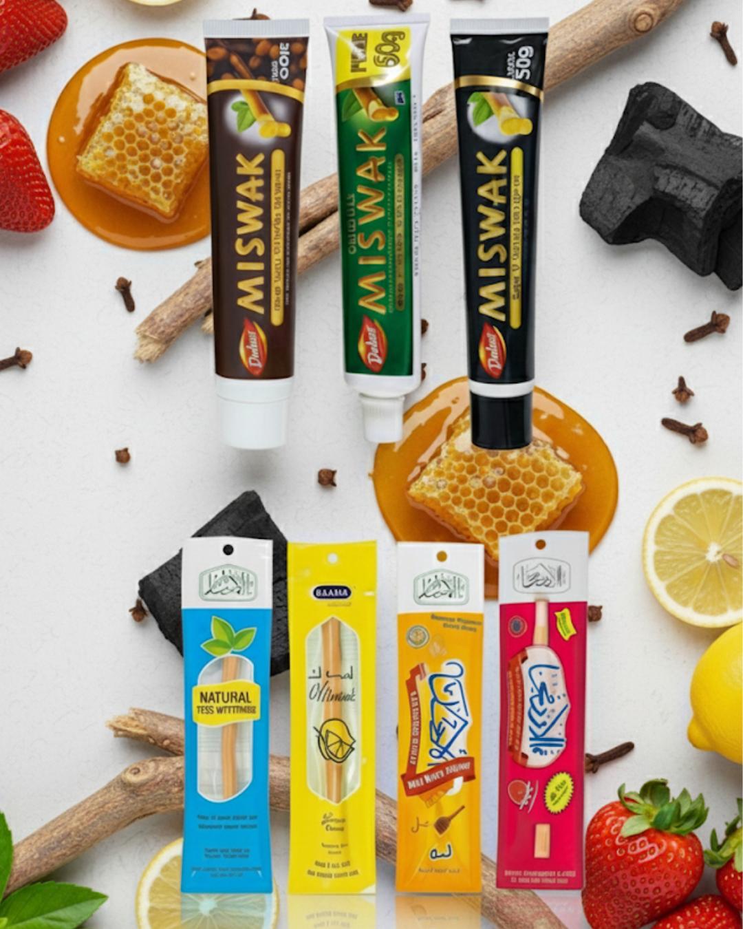 Le dentifrice contient du miswak naturel comme ingrédient principal, accompagné d’agents doux et non agressifs pour assurer un nettoyage efficace sans produits chimiques industriels.